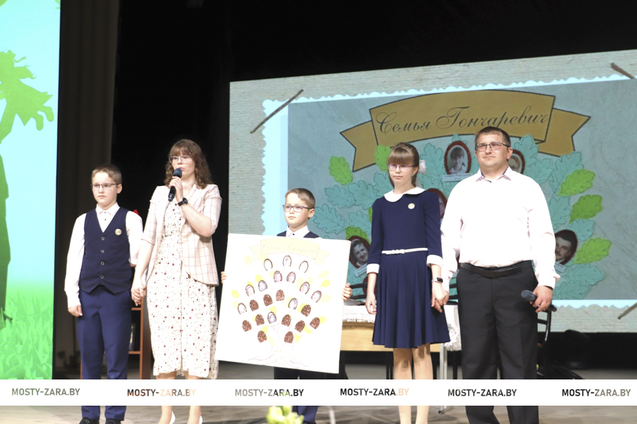 О своих жизненных ценностях и увлечениях рассказала Семья Гончаревич. Папа Сергей Васильевич, работает в ЗАО «Гудевичи» водителем, он активный, инициативный, ответственный. Любит путешествовать вместе с семьёй по историческим местам. Увлекается вырезкой по дереву. В этом же сельхозпредприятии оператором свиноводческого комплекса «Искра» работает и мама Виктория Викторовна. Это активная, целеустремлённая, творческая, ответственная женщина. Любит путешествовать вместе с семьёй. Дочери Юли 13 лет, она учится в 6 классе Лунненской средней школы имени Героя Советского Союза Ивана Шеремета. Она является отличницей, принимает активное участие в классных и общешкольных мероприятиях, является активным участником конкурсного движения. Сыновья Даниил и Никита растут также активными и творческими ребятами. Все вместе они также рассказали историю своего рода, прямо на глазах у зрителей создали семейное древо.
