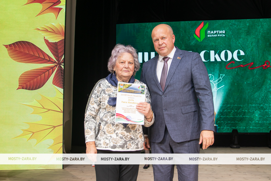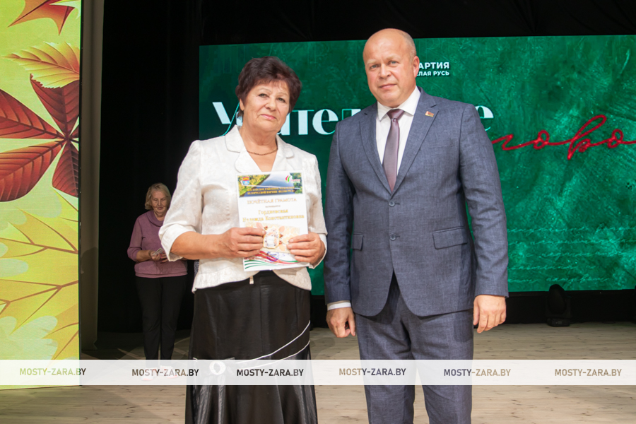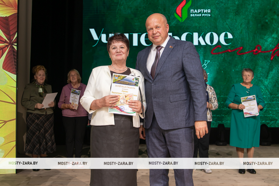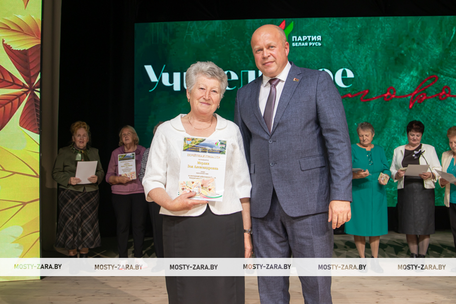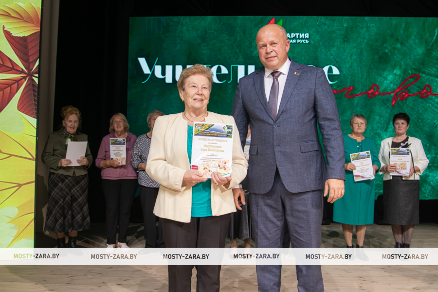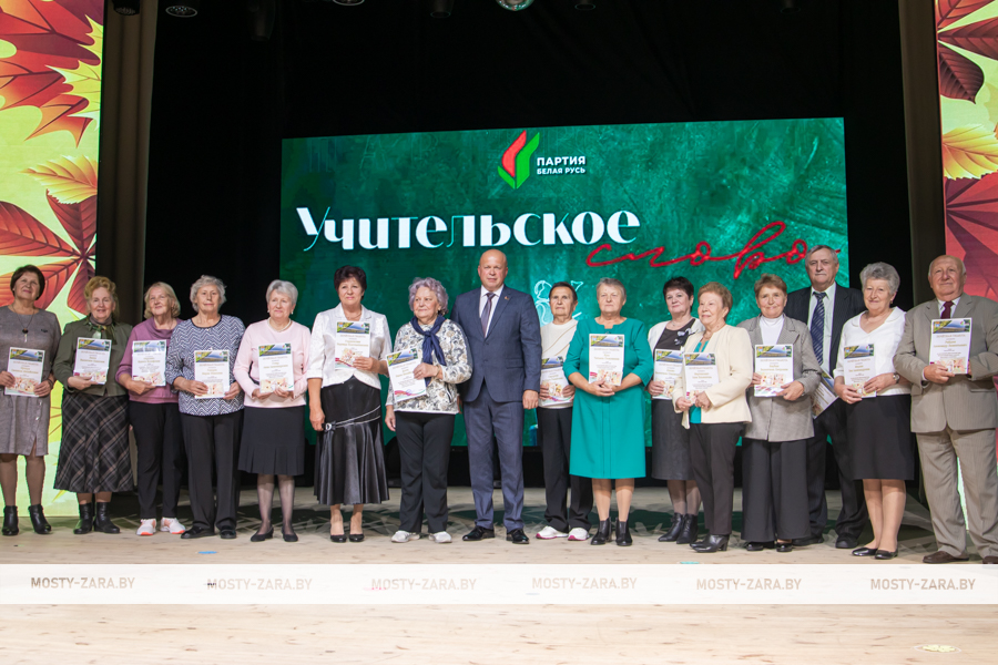 Ко Дню учителя Гродненское областное отделение Белорусской партии «Белая Русь» инициировало проект «Учительское слово». В его рамках прошло чествование и мостовских педагогов-ветеранов. За многолетний добросовестный труд и большой личный вклад в развитие образования и воспитание подрастающего поколения Почётными грамотами Мостовского районного отделения партии «Белая Русь» и ценными подарками были отмечены два десятка юбиляров из числа ветеранов педагогического труда.