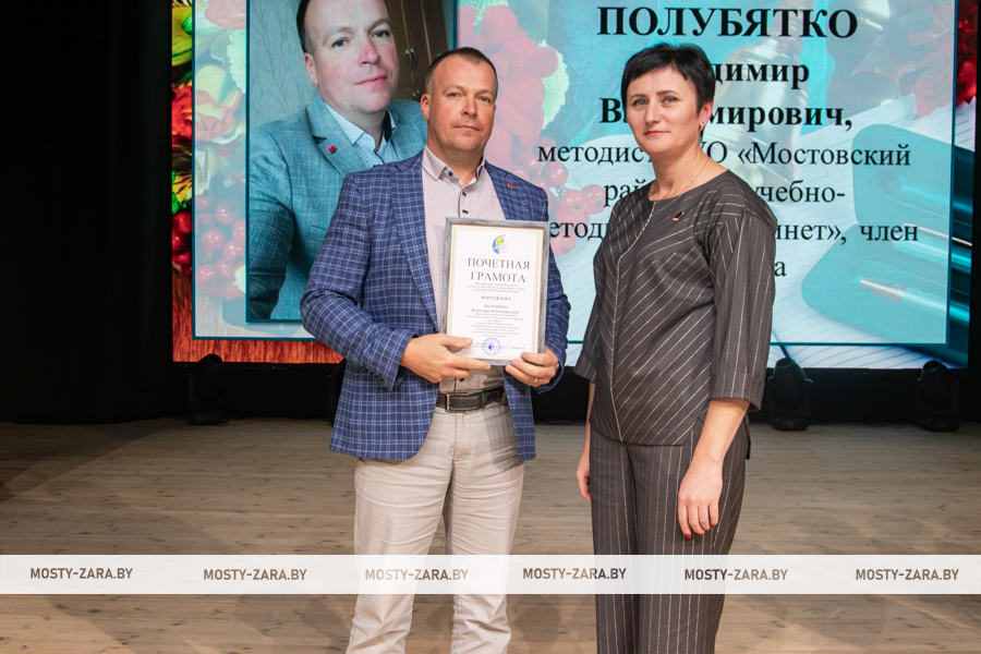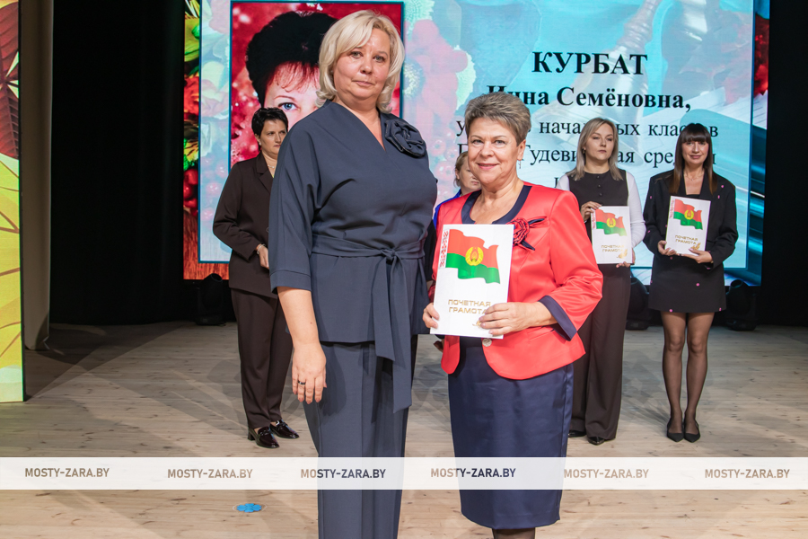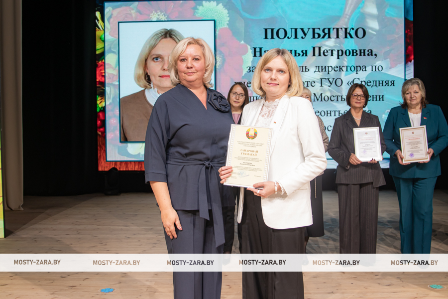Почётной грамотой главного управления образования Гродненского облисполкома награждены заведующий отделом МРЦТДиМ Лариса Глазкина, методист МРЦТДиМ Ирина Костечко, учитель русского языка и литературы Рогозницкой средней школы Татьяна Кузьмич, заместитель директора средней школы №5 г. Мосты имени В. Л. Володося Наталья Полубятко, директор Правомостовской средней школы имени С. И. Болтрукевича Николай Ярец.